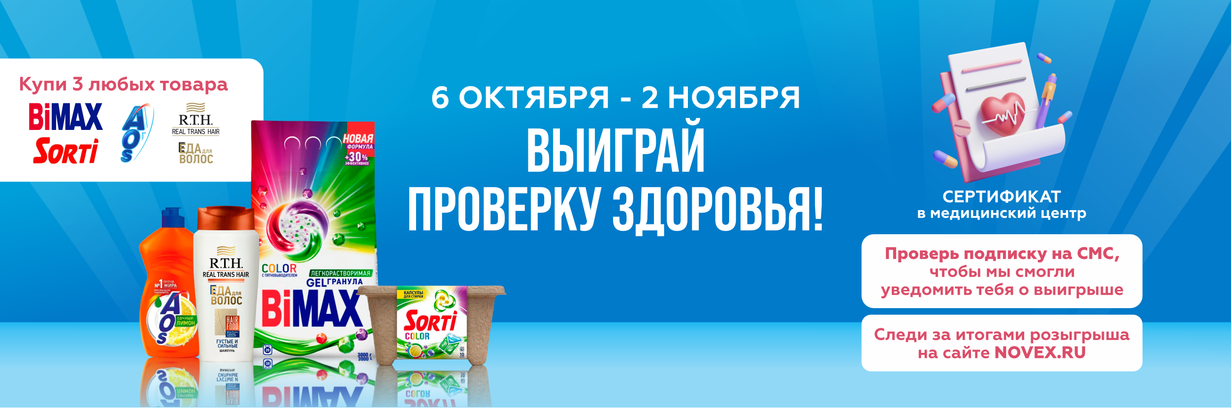 Купи 3 и более товаров-участников брендов AOS, BIMAX, SORTI, R.T.H с 6 октября по 2 ноября и получи шанс выиграть подарочный сертификат в медицинский центр для проверки здоровья! Больше чеков — выше шанс получить приз! 6 ноября мы выберем 3-х победителей!